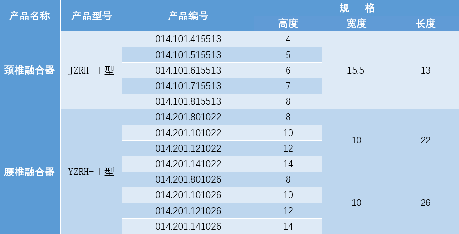 適用于與脊柱內(nèi)固定產(chǎn)品配合使用,治療脊柱椎間盤突出或退變、椎間隙變窄、腰椎假關(guān)節(jié)、復位不理想的蛻變性脊柱滑脫或峽部裂滑脫,用于頸椎、腰椎、腰骶段融合固定。注冊證號:國械注準20203130218